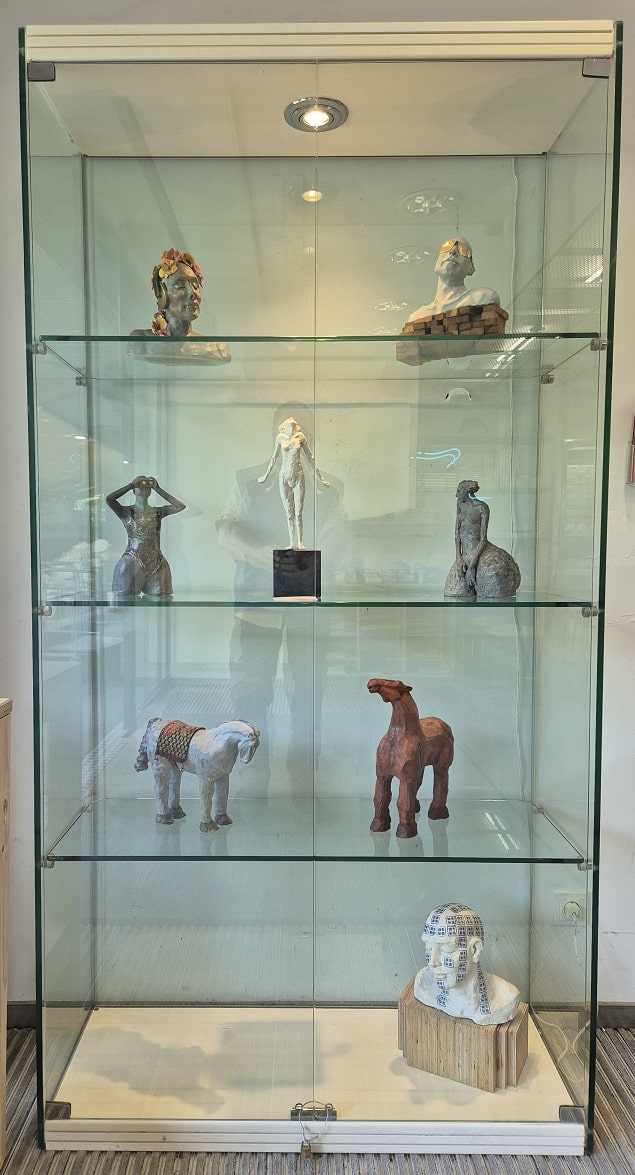 Bij de ingang van onze winkel in Soest staat een vitrine, waarin onze klanten hun werk kunnen tonen. Om de 4 weken wisselt de vitrine van werk.