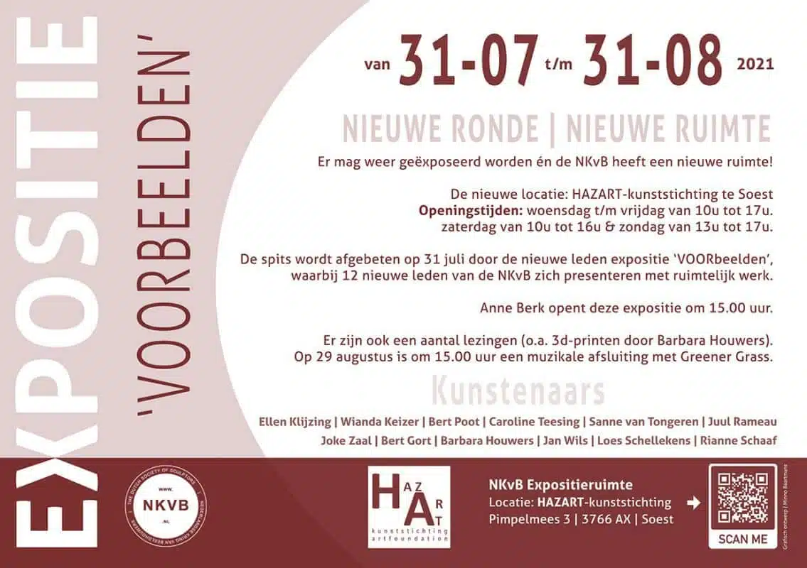 De Nederlandse Kring voor Beeldhouwers (NKvB) krijgt binnenkort een eigen, centraal gelegen, onderkomen. Vanaf 31 juli 2021 zal gebruik worden gemaakt van de locatie bij HAZART-kunststichting in Soest (Pimpelmees 3, 3766 AX, Soest). Met de eigenaren Jan Hazelaar en Ali van den Berg is overeengekomen om, gedurende een proefperiode van anderhalf jaar, de NKvB letterlijk en figuurlijk de ruimte te geven zich te presenteren aan een groter publiek op een vaste locatie.