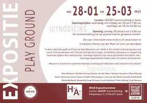 De tentoonstelling PLAY GROUND, georganiseerd door de Nederlandse Kring van Beeldhouwers, wordt op ludieke wijze geopend op zondag 29 januari om 15.00 uur door theatergroep AltijdWat. De theatergroep bestaande uit Ard, Marjolijn, Tiny en Loes zal al bewegend, tastend en kijkend de wereld van PLAY GROUND instappen, geinspireerd door de titel van de expositie en de beschreven ervaringen van de deelnemende kunstenaars.