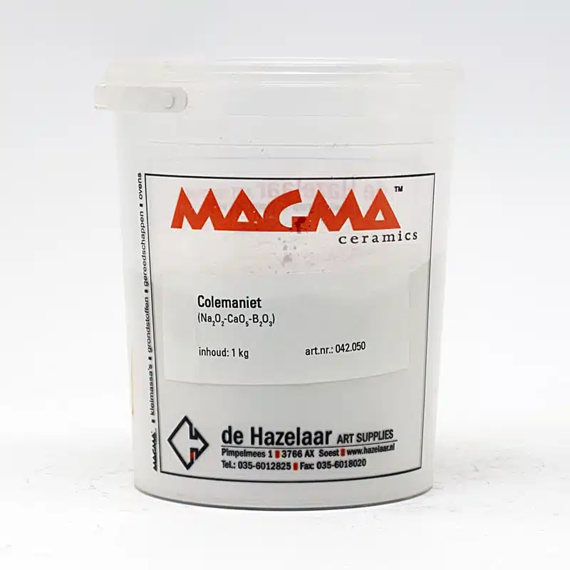 Een bron van kalk en boor. Kan spatten in de oven, dus niet teveel gebruiken. Wordt vaak vervangen door gerstley boraat of door calciumboraat fritte. Colemaniet is een sterk smeltmiddel in glazuren. Het aandeel CaO gaat vanaf 1100°C in actie, terwijl het aandeel B2O3 reeds op 600°C gaat fuseren. Het is daarom geschikt voor glazuren tussen 1000°C en 1100°C. Zeer sterk smeltmiddel boven 1100°C. Tot 600°C langzaam opwarmen, omdat het een groot aandeel moleculair gebonden water bevat.