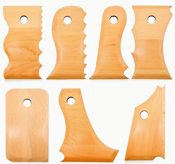 Een 7-delige set houten lomers, geprofileerd om tijdens het draaien verschillende vormen aan je werk te geven.