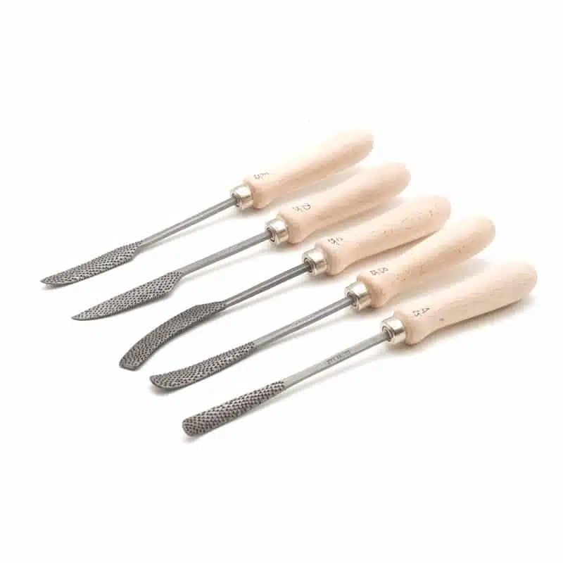 De handgesmede en handgekapte rasp is voorzien van een houten heft en wordt geleverd in de maat 15  of 25 cm. De rasp is geschikt voor het bewerken van zachte en middelharde steensoorten en hout. Leverbaar in 5 modellen.