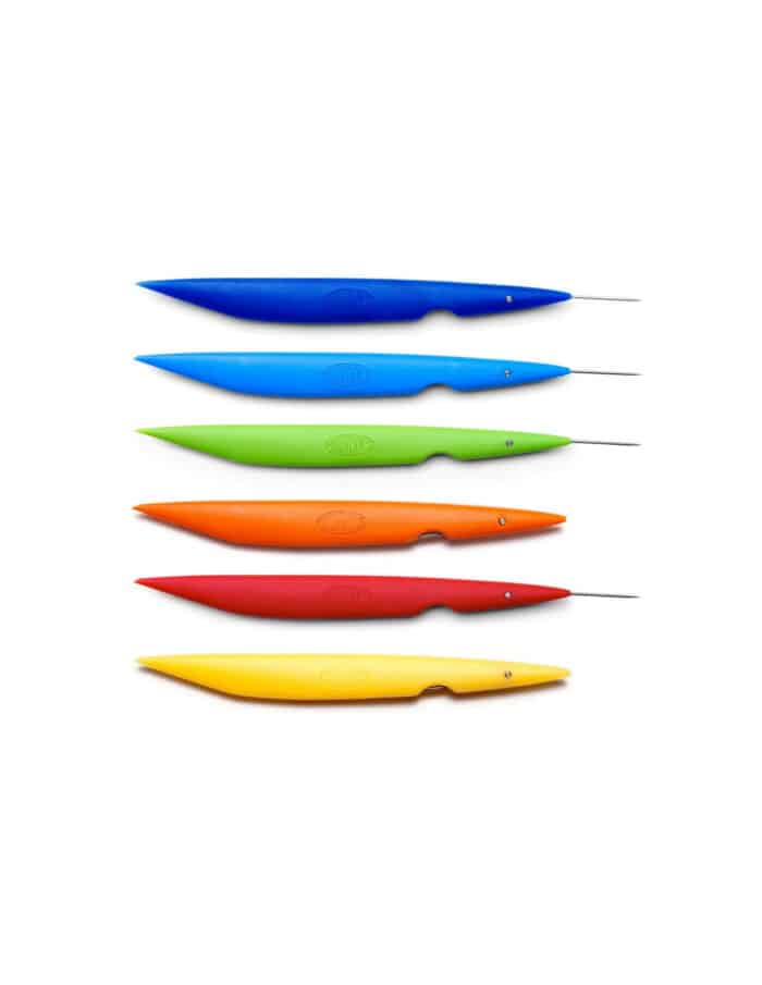 De Mudshark is ontworpen om de twee meest gebruikte gereedschappen te combineren bij het draaien van potten: een naald om de rand aan de bovenkant af te snijden en een mes om de overschot klei aan de basis weg te snijden. Zoals een echte haai zijn tanden, is de Mudshark-naald scherp, dus is hij ontworpen om weg te klappen als je hem niet nodig hebt. Veiligheid eerst!
