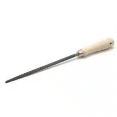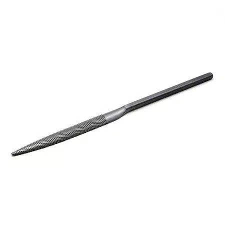 Een 5-delige set iridium naaldraspen met een lengte van 21,5 cm voor het bewerken van speksteen, albast, serpentijn, kalksteen, marmer, hout e.a. De 5 raspen hebben elk een andere vorm: rond, driehoekig, vierkant, halfrond, vlak.