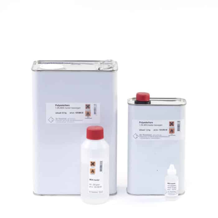 Gebruik met glasmat: vloeibare polyesterhars tesamen met MEK-harder geeft een mooi transparant eindprodukt. De hoeveelheid harder (min. 1% – max. 3%) is niet kritisch, maar met de temperatuur mede bepalend voor de uithardingssnelheid. Let erop de juiste harder voor de hars te gebruiken, want bij gebruik van verkeerde harder zal er geen uitharding plaatsvinden! De hoeveelheid polyester bij gebruik op de standaard glasmat (300 gr/m2) is ca. 700 gr/m2. Bij ‘nat in nat’ lamineren is het gebruik van hars iets minder. Een glasweefsel van hetzelfde gewicht heeft minder hars nodig. Elke laag glasmat (van 300 gr/m2) geeft een dikte-opbouw van ca. 0,5 mm. Op deze manier kan men dus het benodigde aantal lagen glasmat en de hoeveelheid polyesterhars berekenen. Gietwerk met polyester en toeslagmateriaal: Voor het gieten van beeldjes in polyester e.d. moet men altijd de hars vullen met zoveel mogelijk toeslagmateriaal, tenzij men persé een gebarsten of een door de warmte ontwikkeling verkleurd beeldje wil. Mogelijke toeslagmaterialen zijn: kwartsmeel, krijt (droog!), talk en dergelijke. Sommige toeslagmaterialen, zoals o.a. houtpoeder, kunnen problemen geven met de uitharding. Kleuring d.m.v. toevoegen polyesterpigmenten. Probeer daarom eerst een en ander uit met een proefje. Toeslagmaterialen zijn goedkoop, houden de warmte-ontwikkeling en de kans op scheuren door hardingskrimp binnen de perken. De hardingskrimp van pure polyesterhars is 7%.