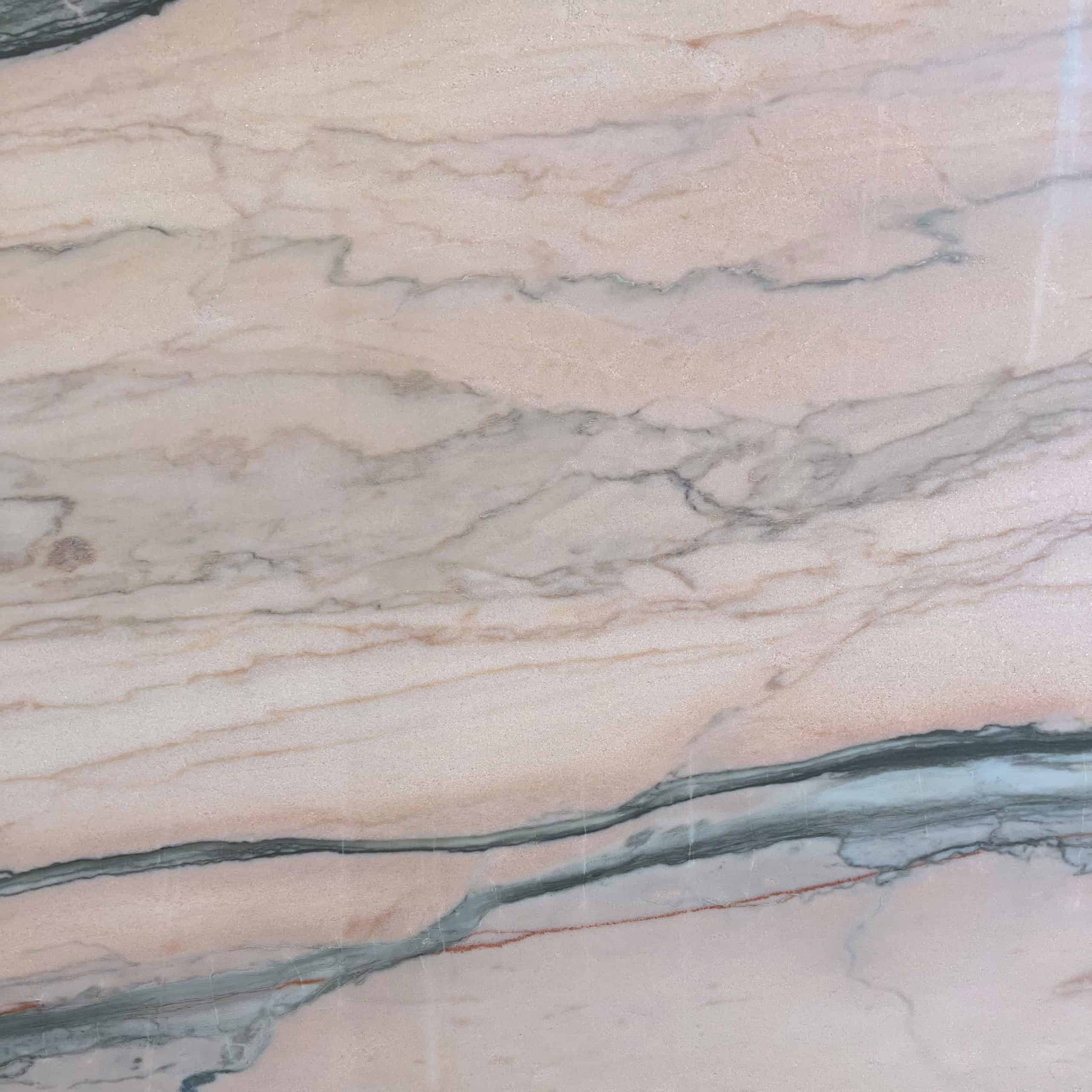 Portugees marmer, van lichtroze tot bijna zuurstokroze met scherpe grijs-zwarte tekeningen. Hardheid ca. Mohs 3.5 – 4 en goed te polijsten.