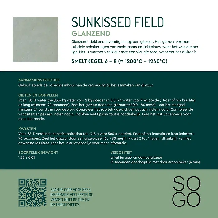 Stook de SOGO glazuren op smeltkegel 7 voor de beste resultaten. Soms kan het steengoedglazuur ook op smeltkegel 6 of 8 gestookt worden. Dit staat aangegeven op het etiket.