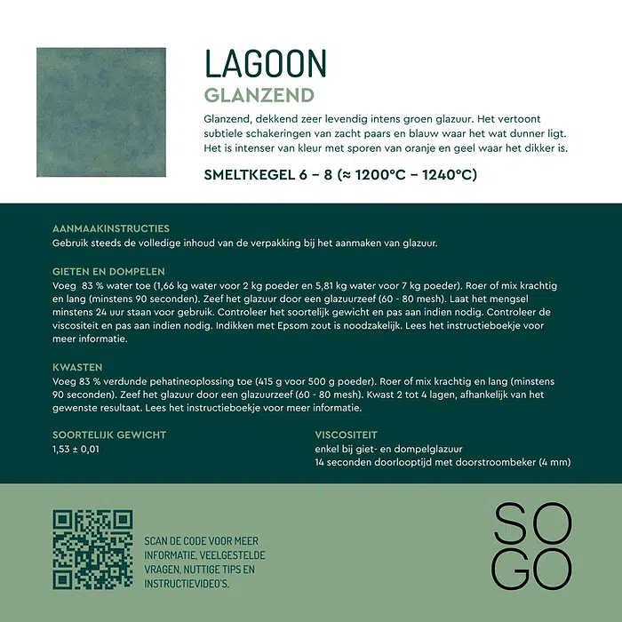 SOGO poederglazuren zijn geschikt om te kwasten, dompelen, (over)gieten en spuiten. Elk glazuur moet altijd goed getest worden zodat parameters zoals viscositeit, soortelijk gewicht, aantal lagen, dikte van het glazuur op de scherf en stooktemperatuur goed gekend zijn. Alle informatie staat op het etiket en het meegeleverde instructieboekje.