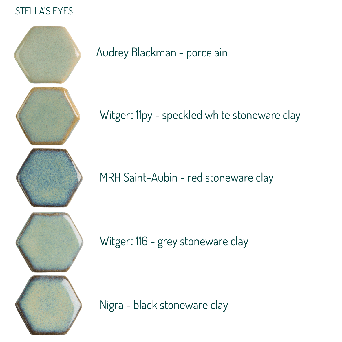 Stella’s Eyes is een glanzend, dekkend levendig groen glazuur. Het vertoont subtiele schakeringen van zacht paars en lichtblauw waar het wat dunner ligt. Het is intenser van kleur met een vleugje roze en okergeel wanneer het dikker is.