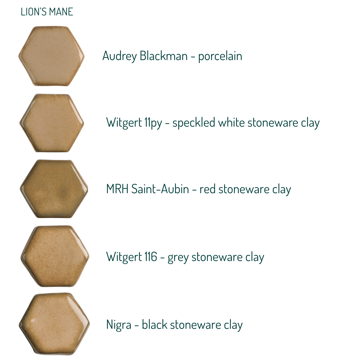 Lion’s Mane is een glanzend, dekkend levendig glazuur. Het vertoont mooie schakeringen van melkchocolade, karamel en kastanjebruin waar het wat dunner ligt. Het heeft een zachte mokkakleur met een vleugje oudroze waar het dikker is.