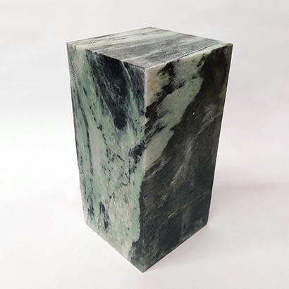 Een strak gezaagd blok zwart met groen speksteen, ongeveer 10x10x20 cm en ca. 6 kg zwaar. Dit is natuurlijk een natuurproduct, dus kleur en tekening kan afwijken. Ook prima geschikt om een sokkel van te maken.