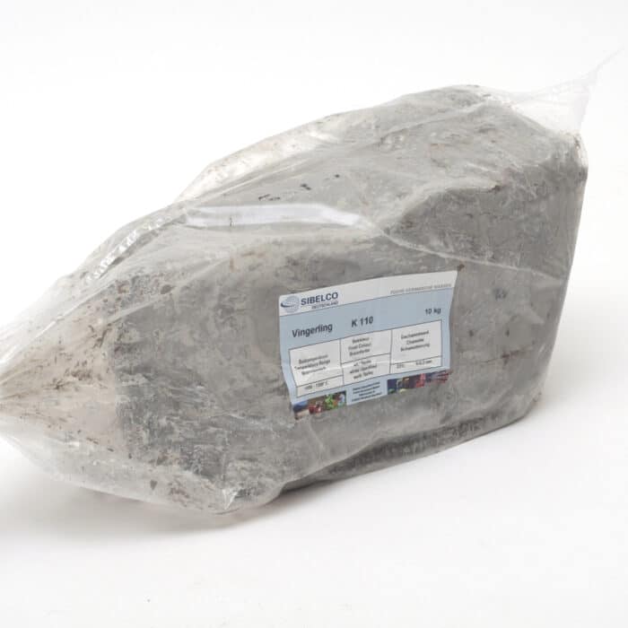 De K110 is een wit-gespikkeldbakkende draaiklei met poederchamotte en wordt geleverd in een verpakking/brood van 10 kg.